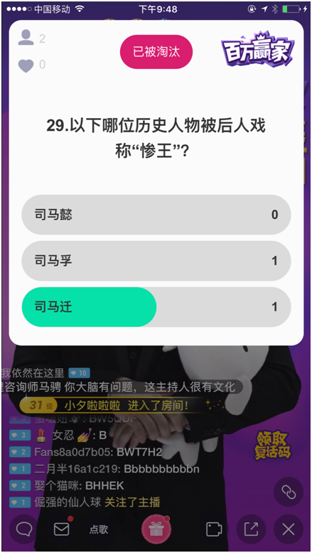 正如之前所预料,花椒“血战到底”战况十分激烈,不但参与人数达到77万,再创单场直播答题人数新高,答题者的实力也是相当惊人。从第26题之后,战局进入了非常紧张的5强大战。最终,在一道关键性的题目上,“以下哪个历史人物被后人戏称‘惨王’”,网友“小雪兒”打败对手,最终以29道题的战绩一题制胜,成为当天的“战神”。