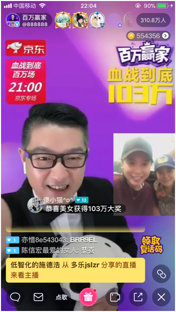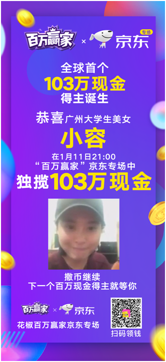 继1月9日和美团推出直播答题史上第一个品牌专场的商业化案例后,1月11日,花椒《百万赢家》“血战到底”新玩法不限12道题的数量,网友PK直到决出唯一的获胜者,独享103万奖金,创造了单人单场最高奖金纪录。