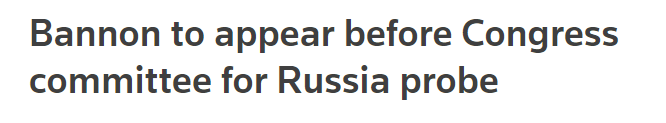 【班农将就通俄门调查接受国会问询】知情人士周四表示,特朗普前首席战略师班农将于下周就通俄门调查接受美国众议院委员会的面谈。消息人士说,下周二的谈话将集中在特朗普竞选期间,而不是在过渡时期或入主白宫的时间段。