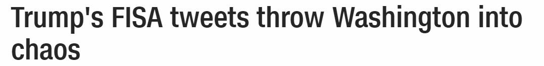 【外国情报监控法投票前 特朗普推特引混乱】特朗普周四早上在推特上质疑外国情报监控法案(FISA),称马上在众议院就重新授权进行投票的FISA计划可能被用来“严重监视”他的竞选活动。 这条推特让共和党立法者和高层情报官员感到困惑,因为特朗普政府在一个多星期前在公开声明中支持了该法案。特朗普的推特一经发出,白宫的电话就几乎立刻被打爆。最终该法案在众议院的投票中顺利通过,不过在投票前的混乱中官员不得不去搞清楚总统的真正立场。