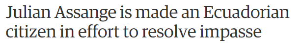【阿桑奇获得厄瓜多尔国籍】厄瓜多尔外交部长向记者透露,维基解密创始人阿桑奇一个月前已经获得了该国国籍,成为厄瓜多尔公民。该国外交部透露,此举是为了解决一直存在的阿桑奇在英国的政治僵局。46岁的阿桑奇已经在伦敦市中心的厄瓜多尔大使馆生活了五年半。厄瓜多尔此举旨在赋予阿桑奇法律豁免权,使他得以离开使馆和英国,而不会因违反其以前的保释条件而被捕。