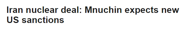 【特朗普或将对伊朗实施新制裁 】美国财政部长努钦告诉记者,他预计特朗普将对伊朗实施新的制裁。特朗普面临周五的截止日期,需要决定在2015年伊朗核协议框架下是否取消对伊朗的其他重大制裁。