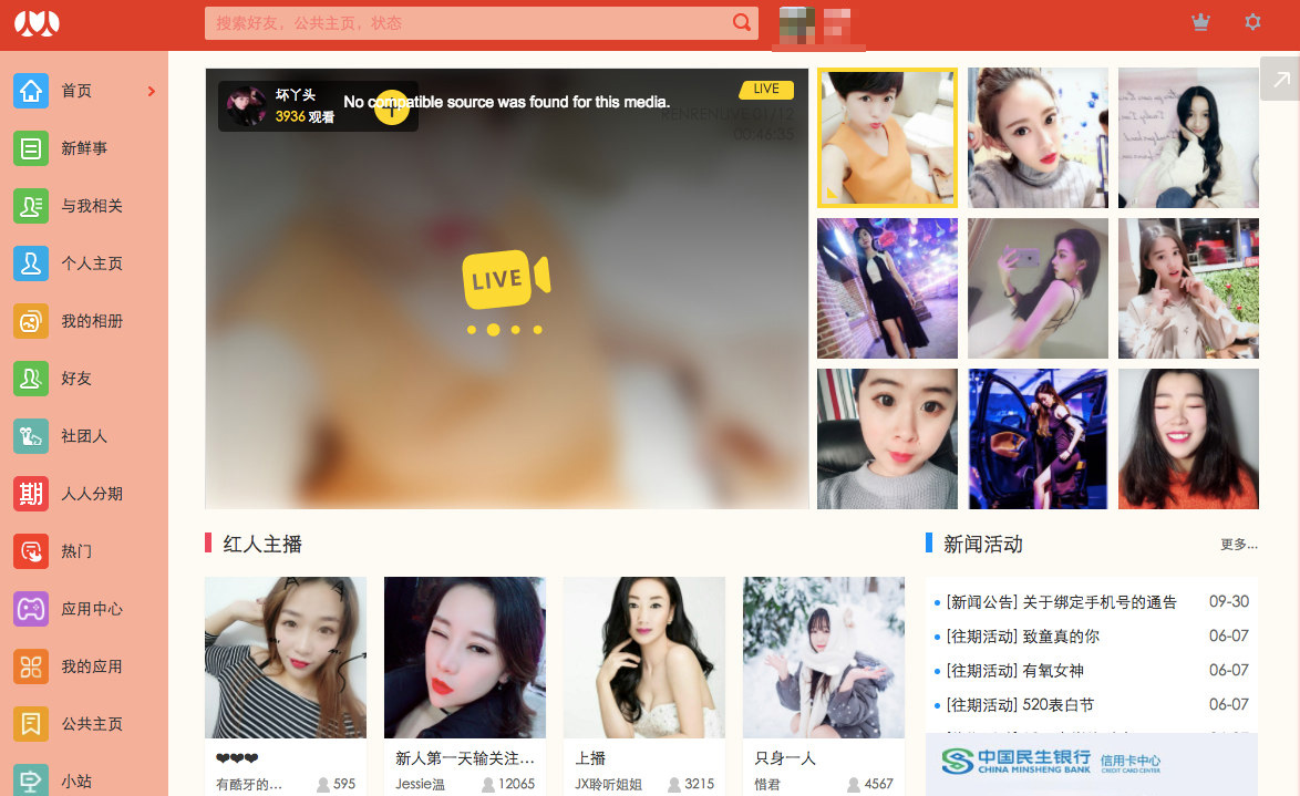 如今再打开人人网的 PC 端主页,你会发现原来熟悉的那个充满老朋友们状态分享的时间线主页,已经被各种网红主播所取代,这是人人网为其新推出的“人人直播”所设置的一个入口。尽管用户还是可以点选侧边栏中的“新鲜事”跳转到原来的人人网页面,但只要打开 renren.com 这个域名,都会先看到这个直播入口。