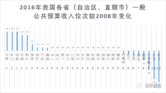 图3.2016年我国各省(自治区、直辖市)一般公共预算收入位次较2008年变化数据来源|我国统计局,制图|杠杆游戏·张银银