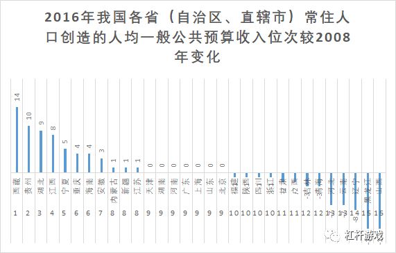 那么,接下来,杠杆游戏将对2008、2016年我国各省(自治区、直辖市)常住人口创造的人均一般公共预算收入及排名变化,进行分析。从中可以非常直观看到,哪些地方的人均地方财税增长最快,发展质量较高。