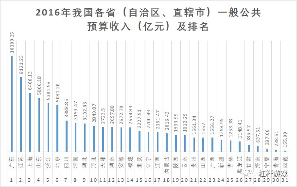 图2.2016年我国各省(自治区、直辖市)一般公共预算收入及排名 数据来源|我国统计局,制图|杠杆游戏·张银银