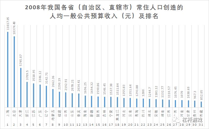图4.2008年我国各省(自治区、直辖市)常住人口创造的人均一般公共预算收入及排名 数据来源|我国统计局,制图|杠杆游戏·张银银