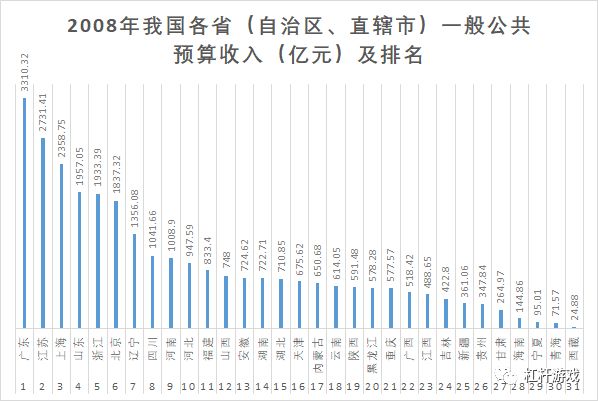 图1.2008年我国各省(自治区、直辖市)一般公共预算收入及排名 数据来源|我国统计局,制图|杠杆游戏·张银银