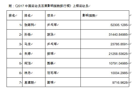 与此同时,《2017中国运动员影响指数排行榜》也在年度峰会暨颁奖盛典期间正式发布,乒乓球名将张继科连续第二年荣登榜首。《2017中国运动员影响指数排行榜》由体育大生意制作,中清宇大数据提供数据支持。体育大生意产业研究中心通过研究网络舆情,考察中国运动员在互联网平台上的影响力。今年的影响指数考察的角度更全面,包括搜索引擎的相关指数、社交网络的舆情指数。