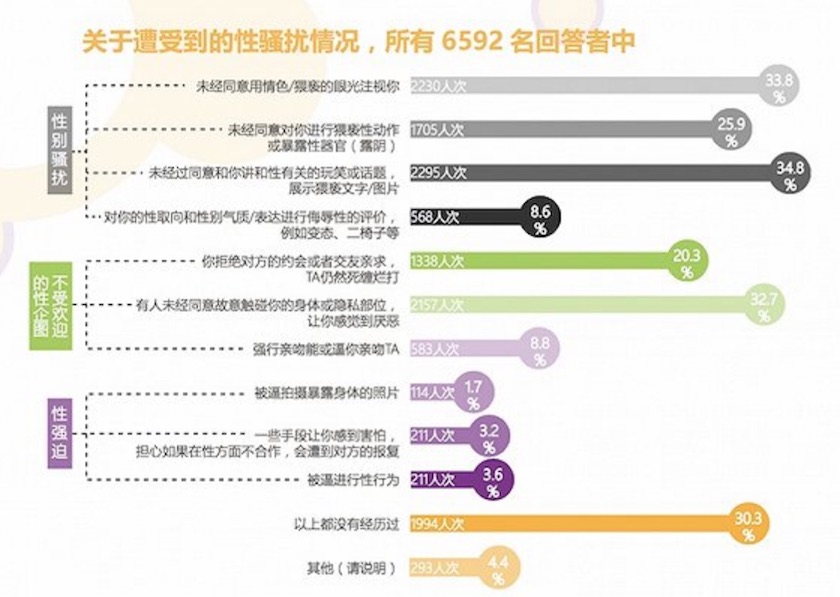 受访者中,有2000人次以上曾经历过“有人未经同意故意触碰身体或隐私部位”和“未经同意讲和性有关的玩笑或话题,展示猥亵文字和图片”,占受访总数的三成以上;曾在逼迫下进行性行为的则有211人次,占总人数之比为3.6%。有高达九成的性骚扰实施者完全为男性,六成为陌生人,半数为同学及校友,学校上级(包括领导、老师和辅导员等) 占一成。