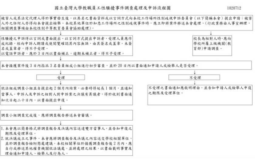 曹薇薇告诉界面新闻,在建立高校防性骚扰制度时,可以参考国立台湾大学的例子。在其官网中,国立台湾大学公布了性骚扰调查处理及申诉流程图,其中将申诉手续和处理流程一一明确,包括申诉内容、调查的步骤和节点、反馈的时效等等。