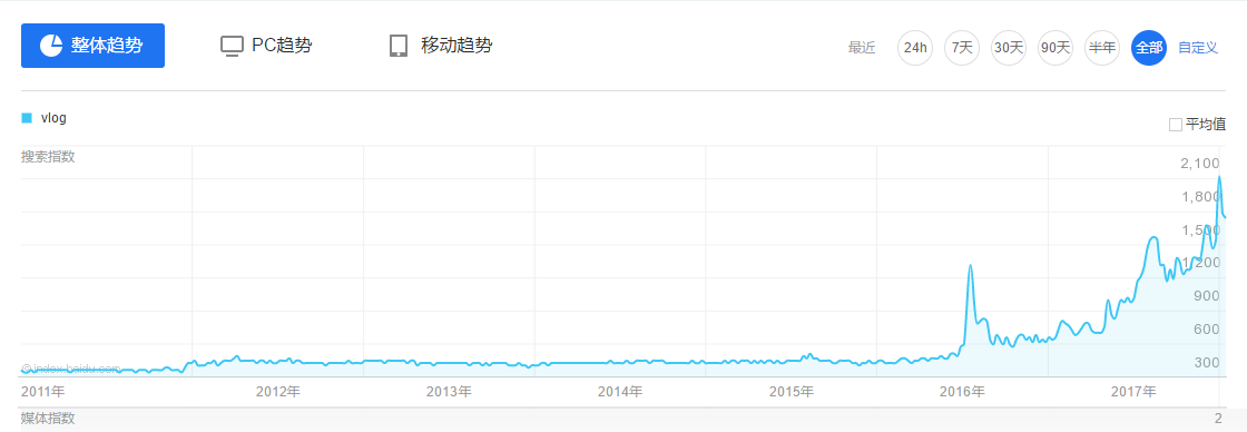这种另类的记录方式同样闯入了国人的视线,席卷各大社交平台。在百度指数搜索“Vlog”不难发现,自2016年以来,Vlog的搜索指数急速上涨。