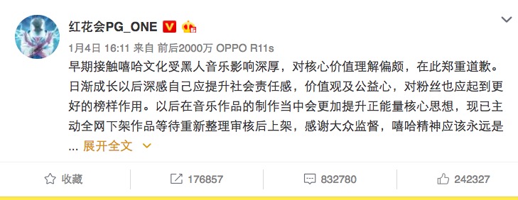 随着事件不断发酵,先是PG One的个人歌曲在各大音乐APP下架,1月16日,网友发现红花会的作品也陆续消失在虾米、网易云音乐等APP中。