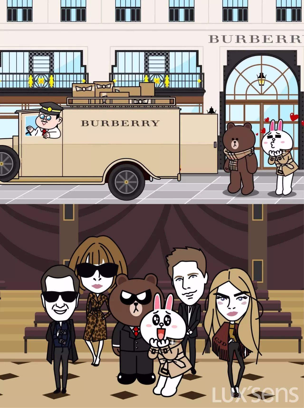 2015年2月,Burberry 与 Line 合作直播 Burberry 2015年秋冬女装秀,还合作推出 Christopher 以及老佛爷等人的系列卡通形象。