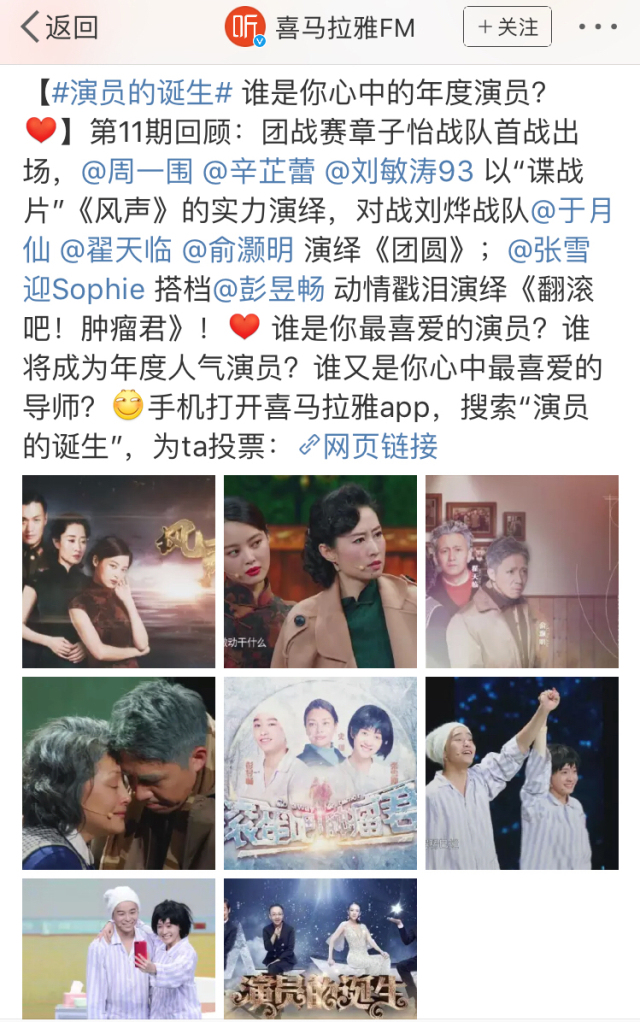 同样,《演员的诞生》作为一个非常具有话题性的节目,也在喜马拉雅FM上播出,并且开通了“中国最佳演员网络投票通道”,票数第一名将获得年度最佳演员称号,这种内容上的深度合作是价值共赢的一种新探索。