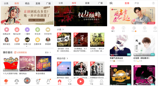 除了上面所提到的综艺版权的引进及IP节目的制作,随着音频平台的逐渐发展,各家平台在各自节目定位上的区分也逐渐清晰。喜马拉雅FM是一个PUGC(UGC+PGC)生态下的音频分享平台,蜻蜓FM是一个高价值内容聚合下的音频平台,荔枝是一个主打“人人都是主播”的语音直播平台。各个音频平台在内容发展和方向上各有侧重。