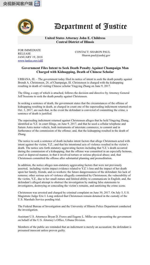 据《中国日报》消息,美国联邦政府于当地时间周五下午发表由美国司法部部长杰夫·塞申斯(Jeff Sessions)签署的文件,决定对涉嫌绑架致死中国访问学者章莹颖的嫌犯布兰登特·克里斯滕森(Brendt Christensen)寻求死刑。