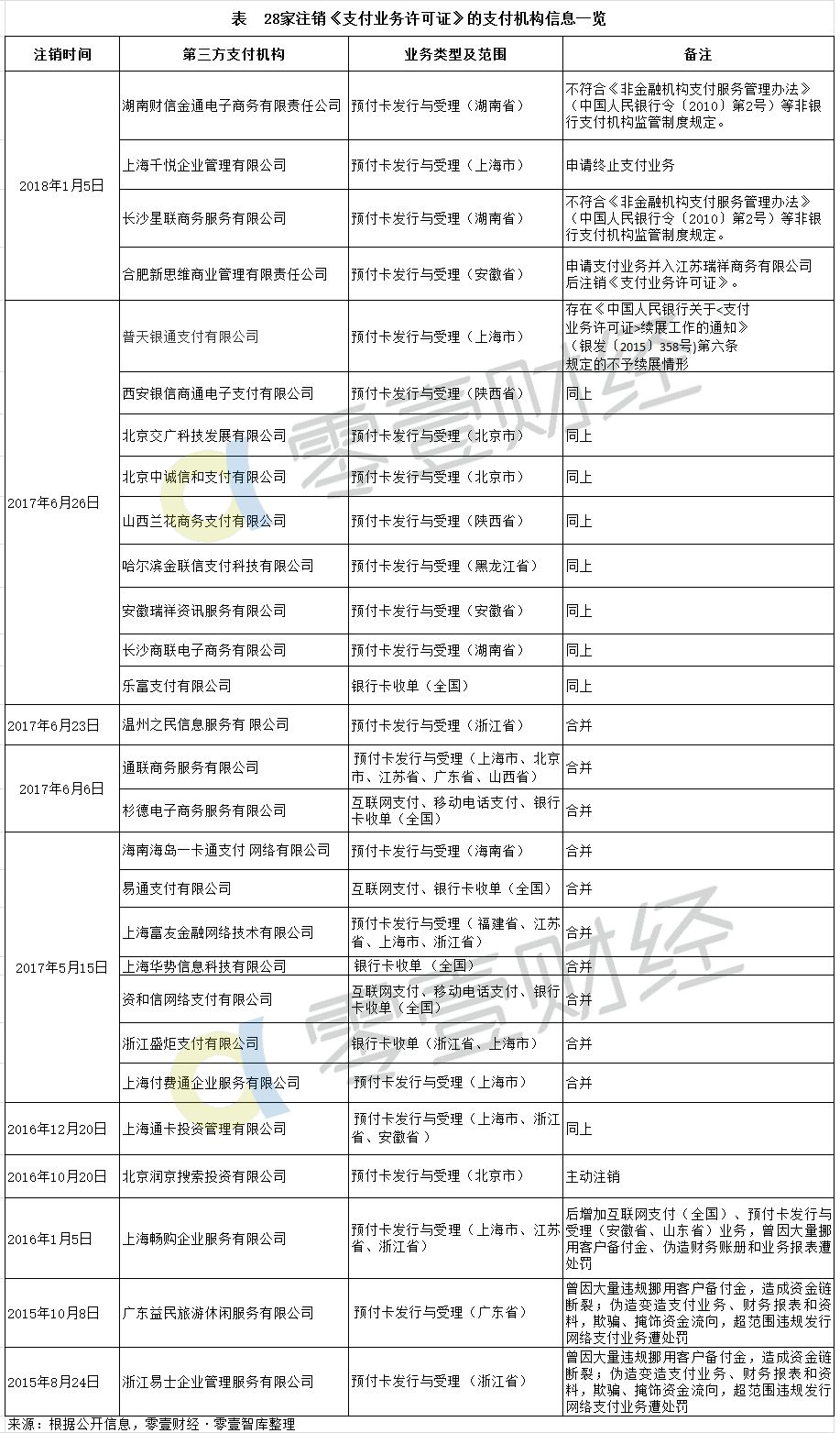截至目前,央行共为271家支付机构发放了《支付业务许可证》,已被注销支付牌照的支付机构有28家,最终支付机构缩减至243家。