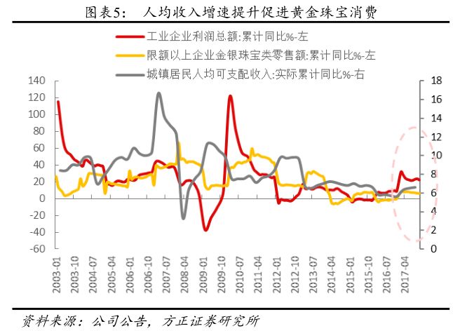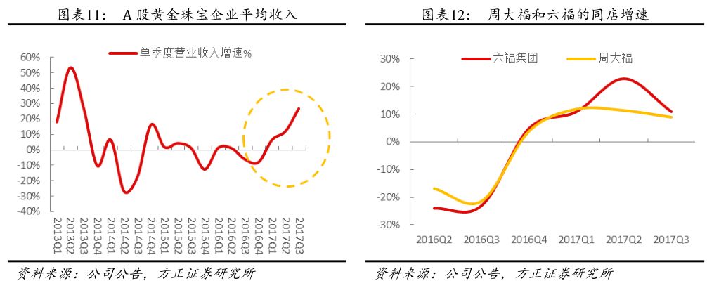 黄金珠宝首饰属于高端可选消费品,2017年以来复苏势头强劲。2013年之后,受收入增速下滑、金价暴跌、反腐等因素的影响,黄金珠宝行业从2014年开始增速放缓,由于前期门店扩张速度太快,再加上线上对线下商场百货的冲击,不少企业经历了调整,关店数量明显增多,同店业绩下滑严重。但2016年下半年,随着收入增速的回升,需求端开始明显回暖:限额以上企业零售额由2016年的负增长开始转正,2017年前11个月累计同比增长6.2%;而A股的黄金珠宝零售企业的平均单季度收入增速不断加速,2017年三季度的收入增速约27%,收入增速一方面来自门店的增加(周大福2、3季度净增加112家,六福前3季度新增50家,周大生前3季度增约150家,通灵全年预计新开120家),另一方面来自同店的增长,周大福2017年前三个季度的同店增速保持在10%左右,而六福三个季度的同店增速均在10%以上,二季度达到23%。