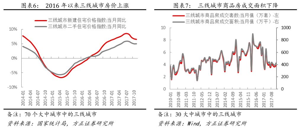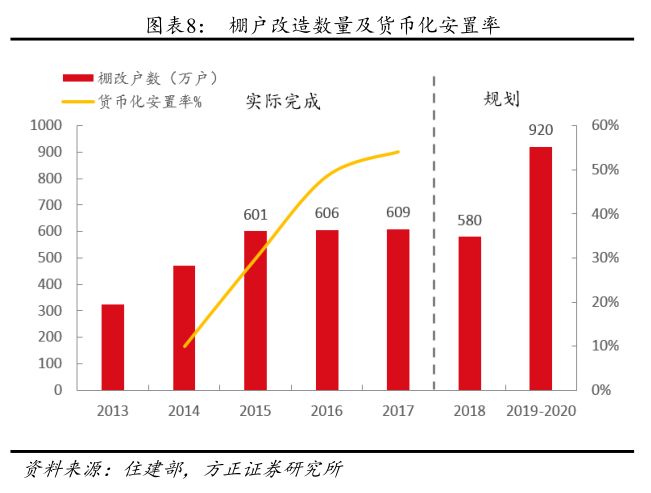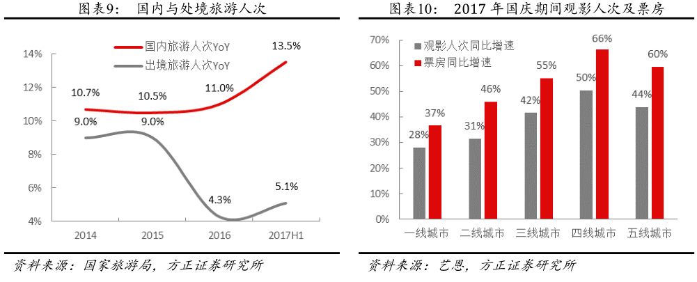 可支配收入增长提速、房价温和上涨、棚改等因素促使可选消费需求快速提升,三四线城市尤为明显。从2017年初,在工业企业利润增速大幅提升,增速从2016年的个位数变成20%以上,带动居民可支配收入增速的提升(增速中枢从6%以下提升到6.5%)。2016年下半年以来,三四线房地产价格开始上涨,房价上涨带来的财富效应利于增加居民的消费倾向,于此同时地产的销售面积则见顶回落,意味着地产对可选消费的挤出效应较弱。此外,棚户改造工作正在加速推进,近3年改造的套数超过600万套,货币化安置率也不断提升,根据国务院的规划,2018~2020年计划改造1500万套,其中2018年计划改造580万套,货币化率预计会继续提升,棚改带来的财富效应将持续。在多个因素的驱动下,今年休闲娱乐、酒类、珠宝可选消费需求有明显的提升,例如2017年上半年国内与处境旅游人次的同比增速分别为13.5%和5.1%,相比2016年的11%与4.3%有明显提升;此外,2017年国庆期间的观影人次及电影票房相比2016年均有大幅提升(增速分别为37%和50%),其中三、四、五线城市的增速明显高于一、二线城市的增速。