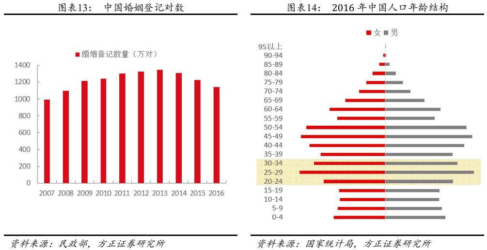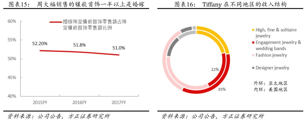 目前我国珠宝消费的主要场景是婚庆领域,未来占比会逐渐下降。目前,消费者主要是在结婚、新生儿、新年等节庆时期购买珠宝首饰,而其中最大的需求来自婚庆市场,周大福镶嵌类首饰的销售额有50%是来自婚嫁珠宝,过去5年的适婚人口(即目前20~35岁的人口)在总人口中的占比较大的,因此结婚登记对数也在2013年达到了最高峰,之后开始下降,2016年登记对数为1,143万对;而未来5年,即将进入适婚年龄的人口(即目前15~19岁人口)数量有所下降,预计黄金珠宝市场中来自婚庆市场的比例未来将有所下降。