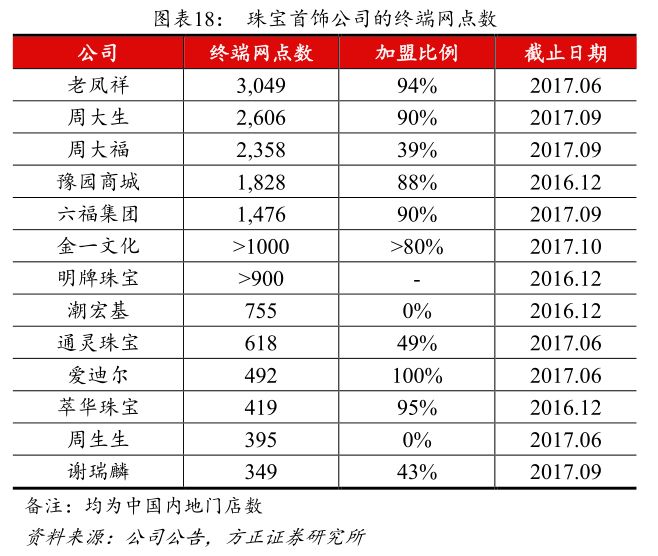 渠道充分下沉三四线,以央视国家品牌计划+门店快速铺设的方式抢占市场份额。公司瞄准正处于消费升级阶段的三四线消费客群,定位黄金珠宝国民品牌。公司入围了2017央视国家品牌计划,在央视投放的广告覆盖9.88亿人,起到良好的品牌宣传效果;此外,公司将借助各优质区域性品牌的资源和经验,在全国性品牌较少的三四线城市以加盟的方式进行快速的门店扩张,提前抢占市场,借助行业整合的契机提升市占率。