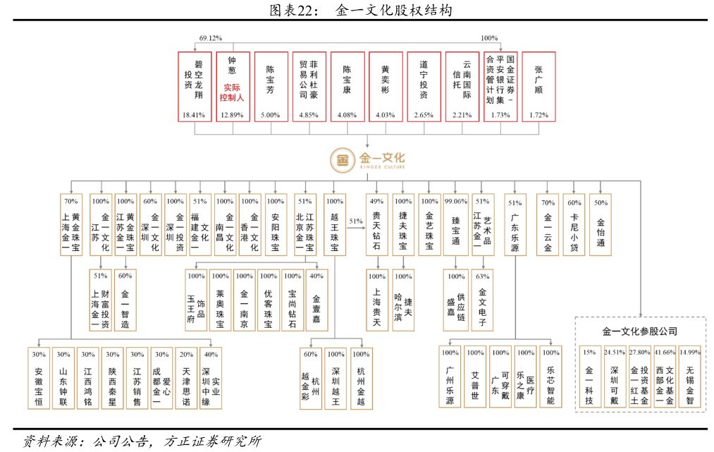 公司实际控制人钟葱先生共持有公司33.03%的股份,其中直接持股12.89%,并通过碧空龙翔和国金证券-平安银行的资管计划间接持股20.14%。前十大股东中的陈宝康(公司副董事长、总经理)、陈宝芳和道宁投资为原越王珠宝的股东,菲利杜豪为原捷夫珠宝股东,黄奕彬为原金艺珠宝的股东,张广顺为原臻宝通股东,前十大股东合计持股57.57%。公司在江浙沪、安徽、山东、福建、广东、河南、江西、东北、香港等地区均设有子公司,负责公司产品的销售、门店铺设及投资合作等业务;此外,还有子公司负责珠宝设计、生产、批发、供应链管理、供应链金融等业务;公司近年来参与设立了多个基金项目,投资领域包括珠宝首饰、文化创意产业及智能制造等。