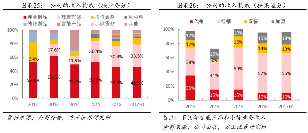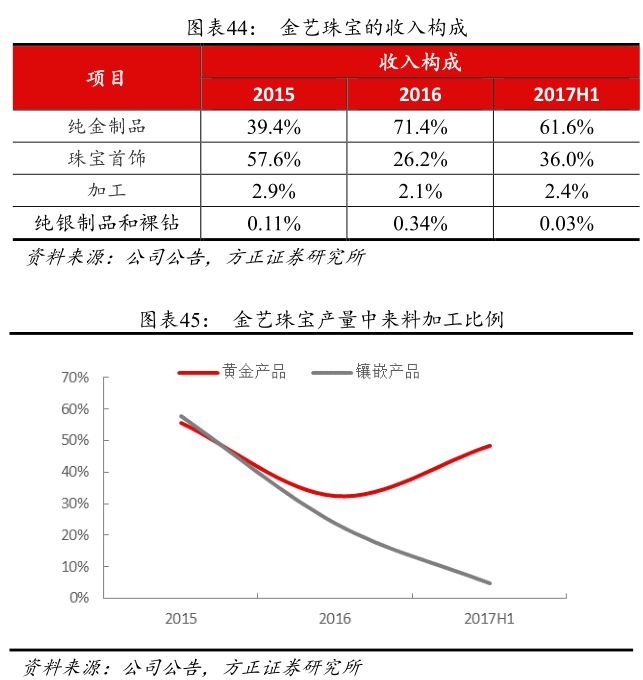 公司的产品可分为三大类,分别是贵金属工艺品、黄金珠宝首饰和智能可穿戴设备。截至2017H1,公司拥有研发设计人员达232人,占公司员工总数的8.26%;已与中国美术学院签署合作协议,在传承发展中国工艺美术、“学院+企业”、建立创新人才培养与实践基地、共同建设艺术衍生品开发基地等方面达成合作。产品亦不断推陈出新,已推出“瑞金·1931”、“玫瑰之心”、“珠联壁合”、“水韵”等具有文化特色的系列产品,此外还结合新签品牌代言人推出主打产品品牌“喜悦”(由北京奥运会奖牌主创设计师之一的肖勇带领的金一设计团队设计开发),打造一系列喜文化产品占据黄金珠宝喜事消费场景。