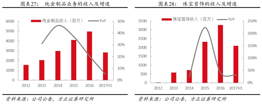 受益于外延扩张及业务的持续开展,公司近年收入保持高增速,珠宝首饰业务占比迅速提升。公司近年来营业收入快速增长,4年CAGR38.5%,2016年收入达到108亿元。从品类来看,目前公司最主要的收入来源是纯金制品,2017H1的收入占比达到45.5%;随着公司的经营重心向珠宝首饰领域转移,且先后收购了越王珠宝和宝庆尚品2个品牌,珠宝首饰的收入和占比快速提升,2013~2016年收入CAGR达到78%,占比也从2013年的17.6%提升至2017H1的33.5%。从渠道来看,由于贵金属工艺品和投资金条的销售占比有所下降,所以银行代销渠道的收入占比有所下降,而零售、加盟渠道的占比逐步提升。