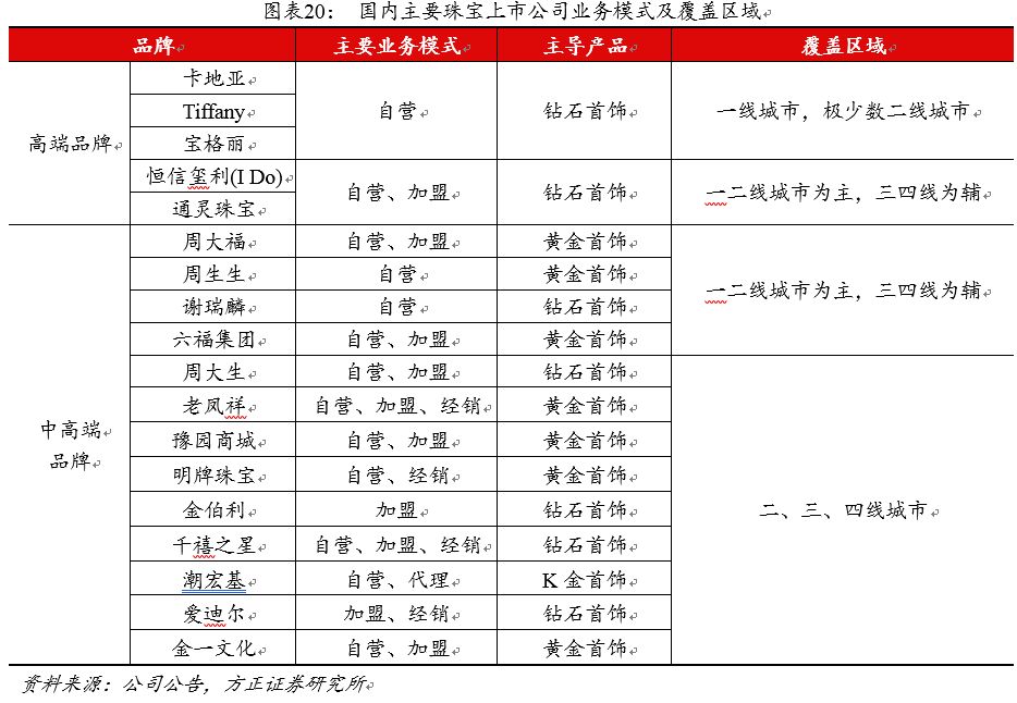 黄金珠宝首饰产业链可以分为上游的原材料开采和销售,中游的设计、制造和批发,以及下游的品牌运营和销售。其中中游的制造和批发环节利润率相对较低(例如主营珠宝首饰制造的金艺珠宝的综合毛利率约10%;以黄金珠宝首饰批发为主业的臻宝通毛利率约5%),而下游的零售环节的毛利率较高,通常珠宝品牌自营渠道的毛利率可达到25~50%(取决于品类和品牌溢价)。部分珠宝品牌商主要专注于品牌的运营和终端销售,将生产制造环节外包出去,例如周大生,好处是可以更加专注于渠道,企业的整体利润率更高,劣势是产品的设计能力较弱;而周大福、老凤祥等综合型品牌商覆盖设计、制造、零售等所有环节,好处是易于维护整体品牌形象,在产品的质量和设计把控能力更强,劣势是运营成本更高,管理难度更大。
