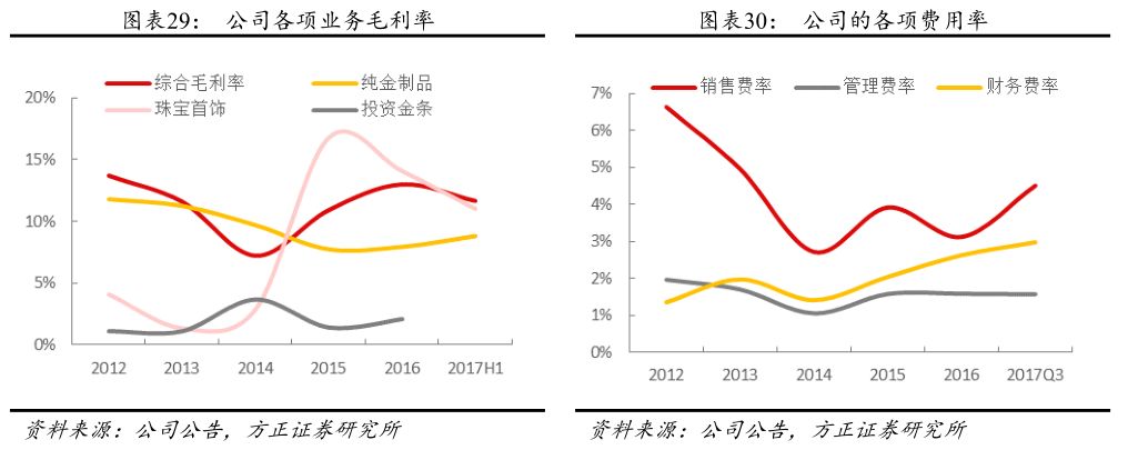毛利率有上升趋势。纯金制品的毛利率呈现下降趋势,是由于黄金首饰市场的竞争加剧,珠宝首饰的毛利率在2015年并表了越王珠宝及宝庆尚品之后有明显提升,高于纯金制品和投资金条,随着珠宝首饰收入占比的提升,公司的整体毛利率呈现上升趋势,2017H1毛利率达到11.7%,比去年同期增加1.1个百分点。