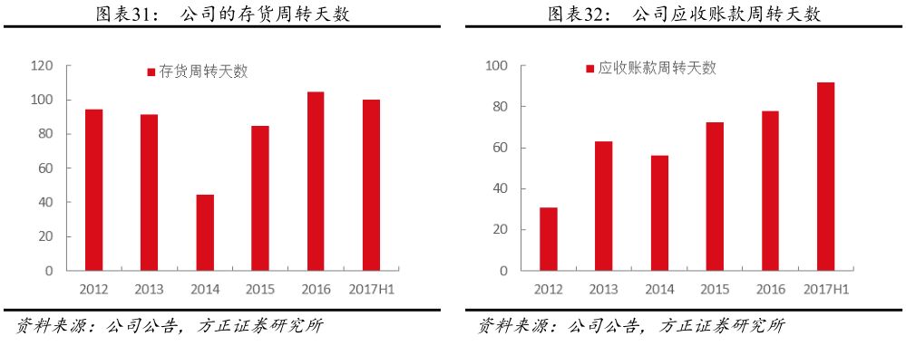 外延并购、品牌战略投入力度加大使销售费率和财务费率有所上升。财务费率自2015年以来逐步上升,是因为公司近年来加大外延并购的力度,资金需求增加,融资规模扩大;2017年销售费率有明显提升,是因为公司入选央视2017国家品牌计划,启动全国规模的营销攻势,因此在广告投入费用明显增加(2017H1广告费用1.38亿元)。公司存货周转天数为100天左右,周转速度位于行业前列;应收账款周转天数为80~90天,周转天数较慢,是由于公司会给部分信任的加盟商一定账期。