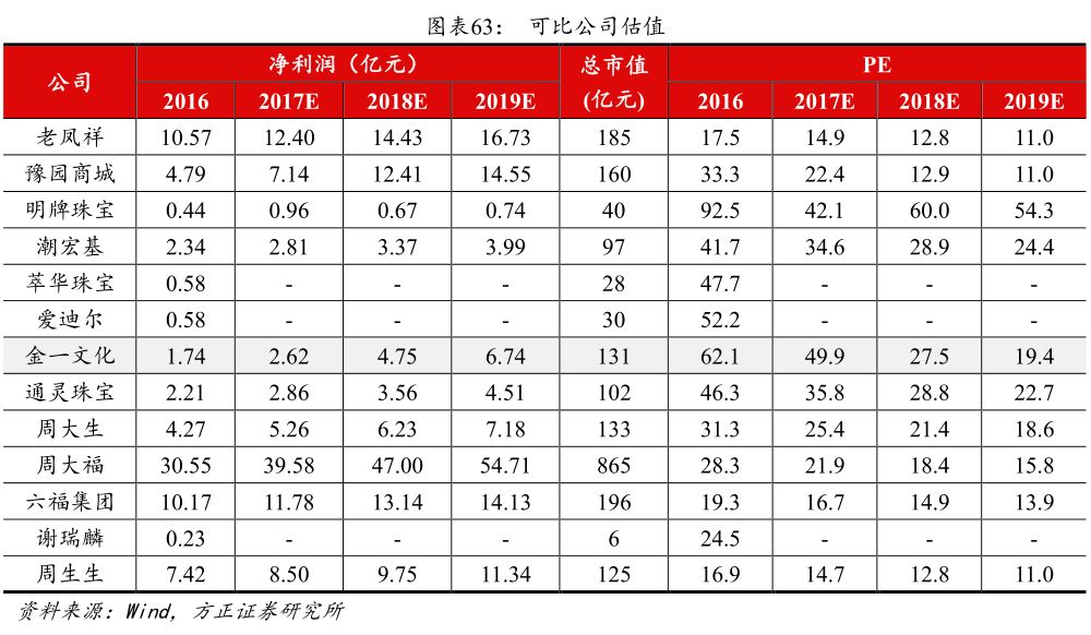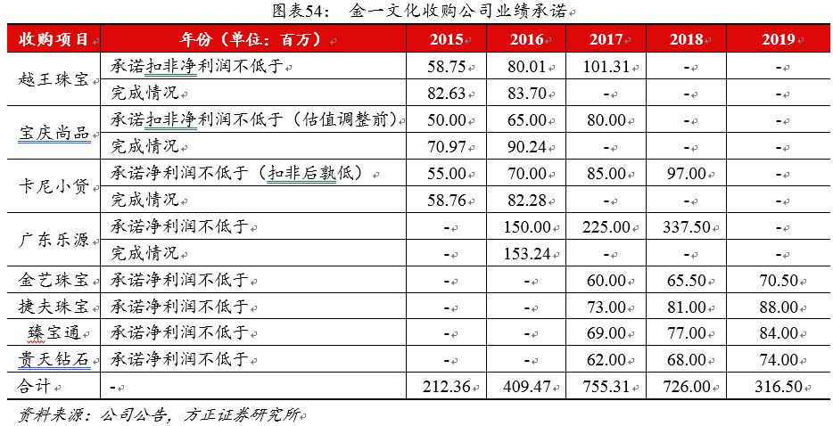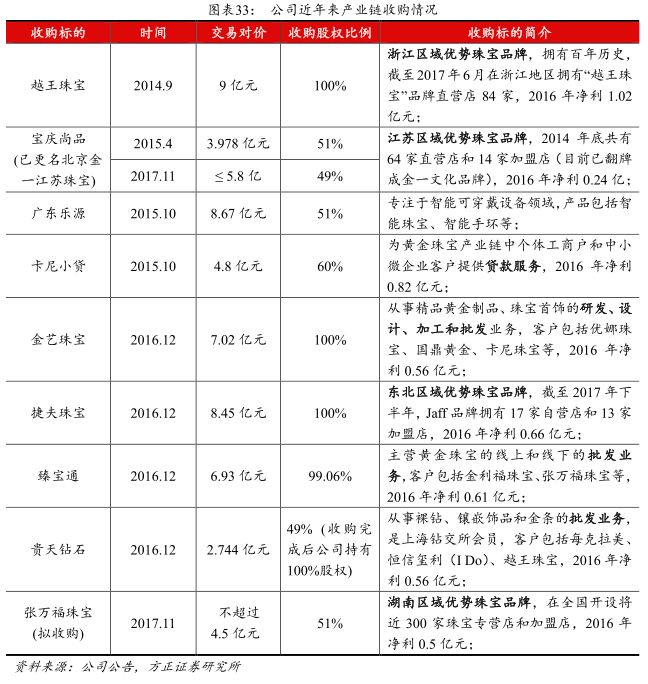 横向、纵向双向收购充实公司业务版图。从2014年收购越王珠宝开始,近年来公司持续推进黄金珠宝首饰行业内的优质企业资源的整合,近期完成了金艺珠宝、捷夫珠宝、臻宝通和贵天钻石的股权收购,初步实现了行业内全产业链布局,从上游生产到下游零售,再到互联网黄金珠宝销售平台,完善黄金珠宝行业制造、销售渠道网络。公司收购的企业可分为两个维度:第一是横向扩张,收购区域性的龙头珠宝品牌,例如越王珠宝、宝庆尚品、捷夫珠宝和拟收购的张万福珠宝,从地理上扩大公司的影响力;第二是纵向扩张,延产业链收购,收购企业涉及的业务领域包括裸钻和黄金的交易,珠宝首饰的研发、加工、批发,和供应链金融等,例如金艺珠宝、臻宝通、贵天钻石、卡尼小贷等。