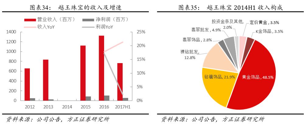 越王珠宝起源于1901年的“陈氏银楼”,是浙江省珠宝行业唯一一家百年老店,先后获得“中国名牌”、“中国驰名商标”及“中华老字号”等称号,销售的产品包括钻石镶嵌饰品、黄金饰品、翡翠饰品等。公司的门店主要分布在浙江省内,目前全部是自营模式,仍然以“越王珠宝”的品牌经营,截至2017H1,浙江省内共有直营店84家。公司近年收入稳定增加,4年CAGR 19%,2016年收入13.25亿元,净利润1.02亿元。