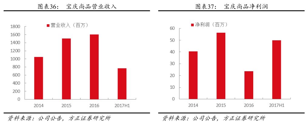 宝庆尚品在江苏省已经营多年,旗下目前共有6家子公司,其中南京莱奥珠宝是优质钻石品牌运营商,主营中高端的钻石镶嵌类产品,有较强的利润贡献能力;另一家子公司玉王府珠宝致力于新疆优质和田玉料的产品开发、代销和批发,生产和加工“玉王府”系列金镶玉首饰。宝庆尚品的店铺遍及江苏省内主要城市并辐射安徽省,在2014年底被金一文化收购之前,共有64家直营店和14家加盟店,积累了大量稳定的顾客基础,多家门店的年营业额破亿,被金一收购之后所有的店铺已经翻牌为“金一”品牌,目前江苏地区金一品牌的门店数约有150家。宝庆尚品在当地市场拥有较为广泛的行业资源、合作经验,具备在省内快速扩展销售网络规模、稳定经营的能力,2016年宝庆尚品的营业收入突破16亿元,近2年收入复合增速24%。