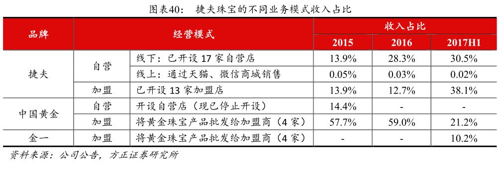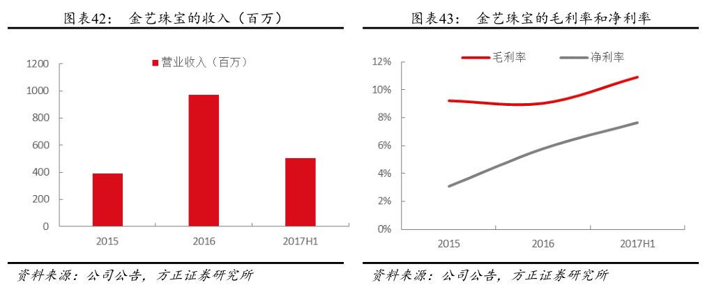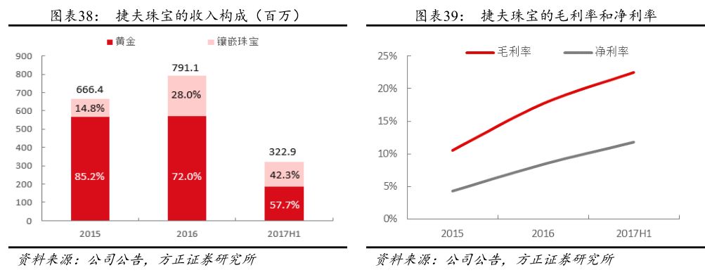 “捷夫”(Jaff)由创始人周凡卜先生于1993年在哈尔滨创建,经历了从以钟表为主业向以珠宝为主业的转变,目前主营珠宝类饰品, 2016年收入接近8亿元。2017H1黄金首饰和镶嵌珠宝产品收入占比分别为58%和42%,镶嵌珠宝的占比持续提升。捷夫作为哈尔滨本土品牌,在东北具有一定的区域性品牌影响力,目前捷夫品牌的门店已经开设了30家(17家自营+13家加盟)。除了自身品牌的运营之外,捷夫珠宝此前还以开设自营店和向加盟商供货的模式代理中国黄金的产品,为了专注自身品牌的运营,目前中国黄金自营店的业务已经停止;2017年开始,捷夫珠宝开始向金一在东北地区的加盟店供货。目前69%的收入是来自捷夫品牌,31%的收入来自给中国黄金和金一的加盟商供货,随着毛利率更高的自有品牌业务占比的提升,捷夫珠宝的毛利率和净利率也稳步上升。