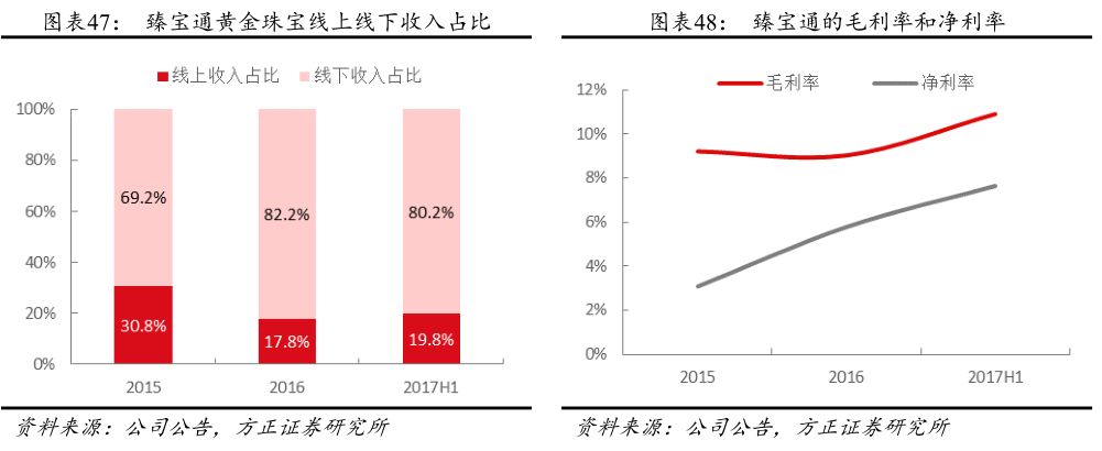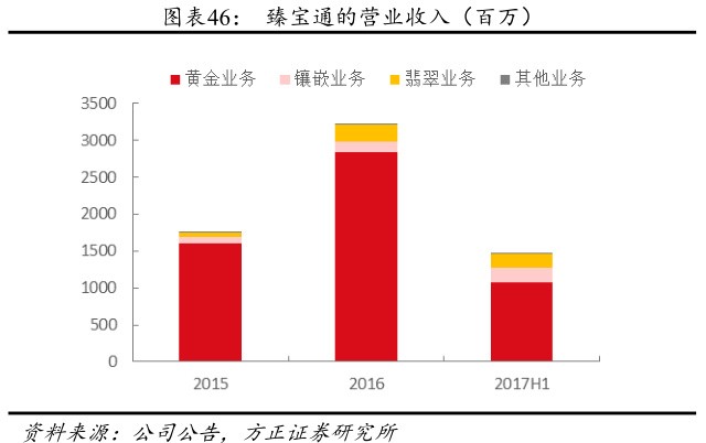 臻宝通自2014年起将业务重心全面移至黄金珠宝批发业务,于2015年7月收购了业务成熟、具有一定市场占有率的深圳盛嘉,结合臻宝通自身的线上技术,形成了“线上平台+线下展厅”相结合的黄金珠宝批发业务的经营模式:线上批发销售业务通过臻宝通建立的在线平台,提供黄金珠宝线上采购服务;线下批发业务由子公司深圳盛嘉负责,通过向上游供应商直接采购黄金珠宝成品或根据客户需要对采购的黄金原料进行委外加工,在展厅铺货对外展示产品,接待客户(二级批发商及黄金珠宝零售商)到展厅选货、采购。臻宝通2016年收入32亿元(YoY+ 83.7%),从品类来看,黄金产品仍然占比70%以上,镶嵌类和翡翠类的占比不断提升(2017H1占比达到27%),此外还有少量K金和银产品;渠道方面,目前仍以线下批发为主,2017H1线下业务收入占比超过80%。