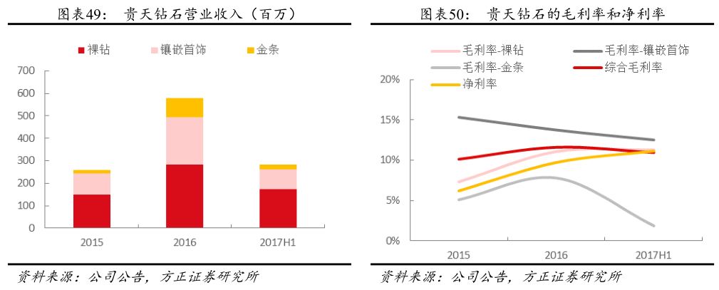 贵天钻石主要从事裸钻、镶嵌饰品和金条的批发业务(镶嵌饰品是由贵天钻石提供原料委外生产),子公司上海贵天是上海钻石交易所的会员单位,收购贵天钻石后公司的钻石采购渠道将得到优化。经过近10年的发展,贵天钻石在全国各地拥有了较为丰富的业务基础,已成为钻之韵、全城热恋、每克拉美、恒信玺利(I Do)、潮宏基、越王珠宝等大型零售品牌的供货商。公司目前处于快速成长期,2016年收入5.8亿元,同比增长124%,其中裸钻批发收入占比49%,镶嵌首饰占比36%,金条占比15%。