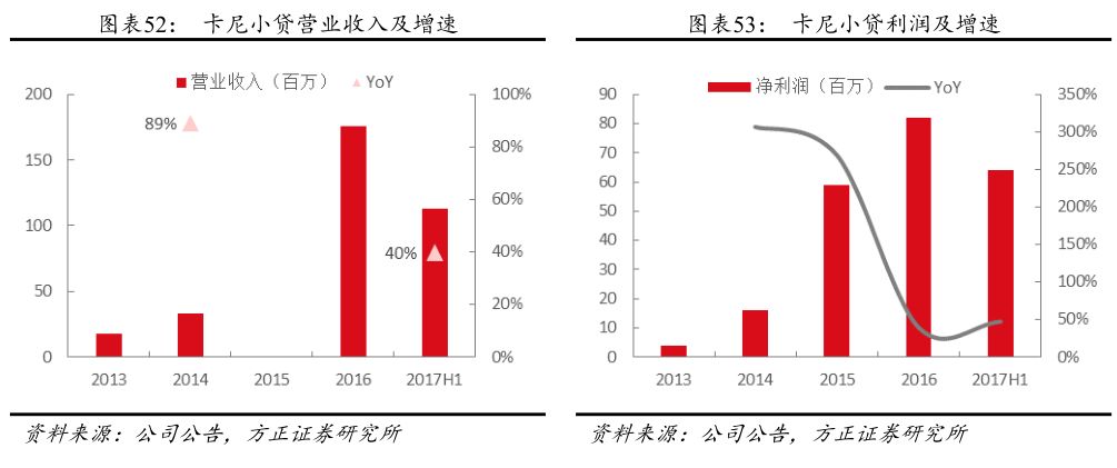 卡尼小贷自设立以来,主要定位为黄金珠宝产业链的融资服务提供商,黄金珠宝行业有重资产的特点,从上游的生产加工企业到下游的零售企业和加盟商在扩大业务时都有较大的资金需求。卡尼小贷主要的盈利来自发放贷款而获取的利差收入,金一收购卡尼小贷后,其为公司上下游客户及行业内客户提供资金支持,为客户增强资源配置效率,目前卡尼小贷有好易贷、互助贷、循环贷和融易贷四种针对不同需求的产品。卡尼小贷近年来业绩快速增长,收入和利润3年CAGR分别为116%和176%,2016年收入和利润分别达为1.76和0.82亿元。