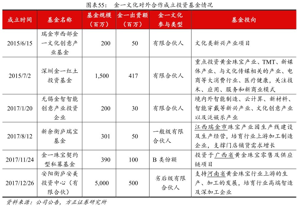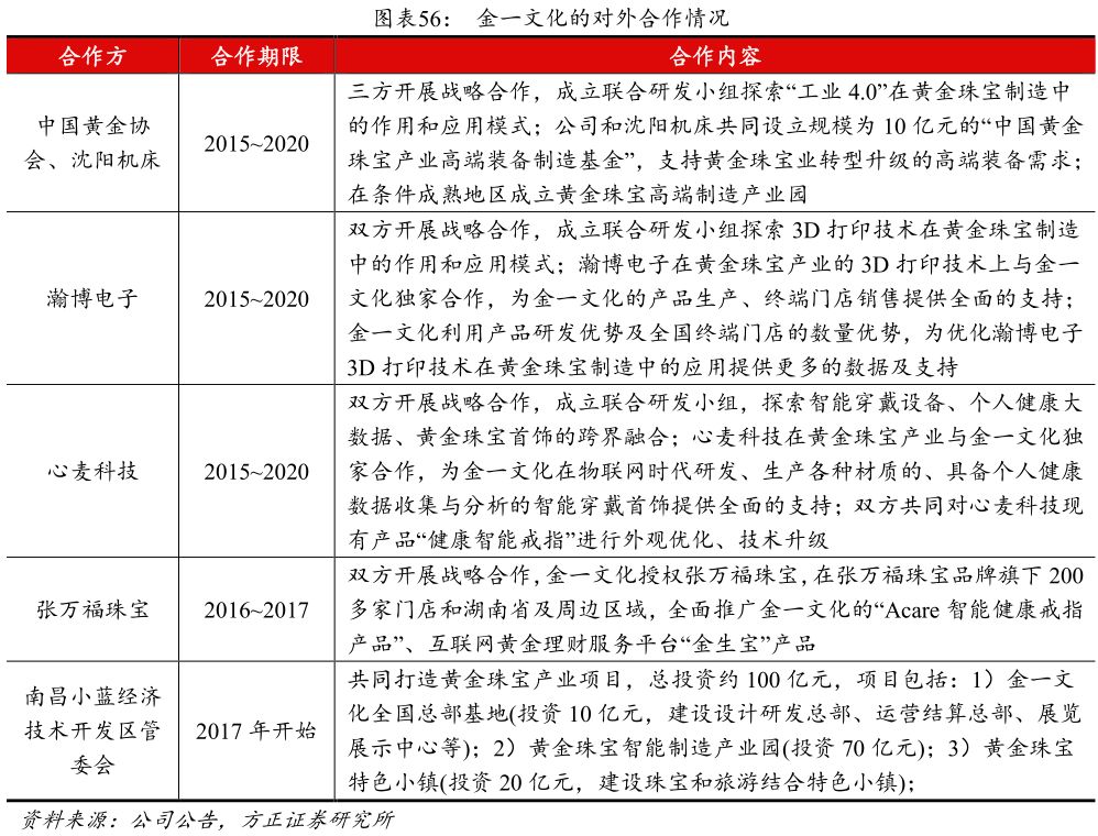 合作成立产业基金,储备各地优质行业资源。公司从2015年开始,合作成立了多个投资基金,总体基金规模超过75亿元,投向各省市的黄金珠宝首饰行业的生产制造、供应链等项目,为公司布局全国的战略储备优质的行业资源。此外,金一还和中国黄金协会、沈阳机床、瀚博电子、心麦科技、南昌小蓝经济技术开发区管委会展开合作,发力黄金珠宝高端制造、智能首饰、黄金珠宝产业园等领域。