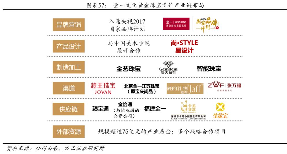 金一文化通过内生生长+外延并购的形式构建黄金珠宝首饰生态圈。金一文化以贵金属工艺品起家,2014年开始发力珠宝首饰领域,先后收购了越王珠宝、宝庆商品、捷夫珠宝等优势区域性品牌,成功扩大品牌影响范围;并延产业链收购了金艺珠宝、贵天钻石、臻宝通、卡尼小贷等珠宝制造、批发、供应链金融企业,提升公司各业务环节的实力。此外,还通过设立产业基金、战略合作等形式在全国多省投资建设珠宝首饰相关研发、制造项目,为公司在全国范围内进行快速渠道扩张提供坚实基础。