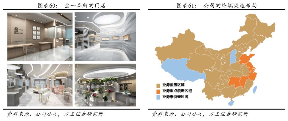 公司此前主营贵金属工艺品,因此积累了大量工、农、中、交等国内大型商业银行,及广发、招商、浦发等股份制银行渠道资源。而公司经营重心向黄金珠宝首饰领域转移后,通过内生发展及外延并购多个区域优势珠宝品牌,迅速扩大门店的布局范围和网点数量,目前公司已完成了浙、苏、皖、豫、赣、湘、鲁等30个省份的布局,业务覆盖区域初步完成全国性战略布局,截至2017年10月,公司共计拥有加盟连锁店、品牌直营及专柜、专卖店等终端零售店超1000家(2017年6月时只有703家)。此外,线上渠道也有布局:“金一|KINGONE”品牌旗舰店在天猫平台已正式运营,现有APP金一珠宝及苏宁易购、工行融易购等线上销售平台均已上线运营,并将不断拓展优质互联网线上渠道。