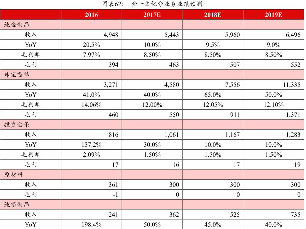 公司目前已完成初步的黄金珠宝首饰生态圈的构建,此次收购完成后将完成对上游珠宝设计生产环节的业务覆盖,为之后全国布局战略提供了供应链端的保障;此外,公司已收购了江苏、浙江、东北、湖南地区的优势珠宝品牌,在安徽、山东、江西、陕西地区设立了子公司,预计各地加盟商门店的开设将加快速度。假设公司传统的贵金属工艺品和投资金条业务维持温和增长,珠宝首饰业务快速提升。