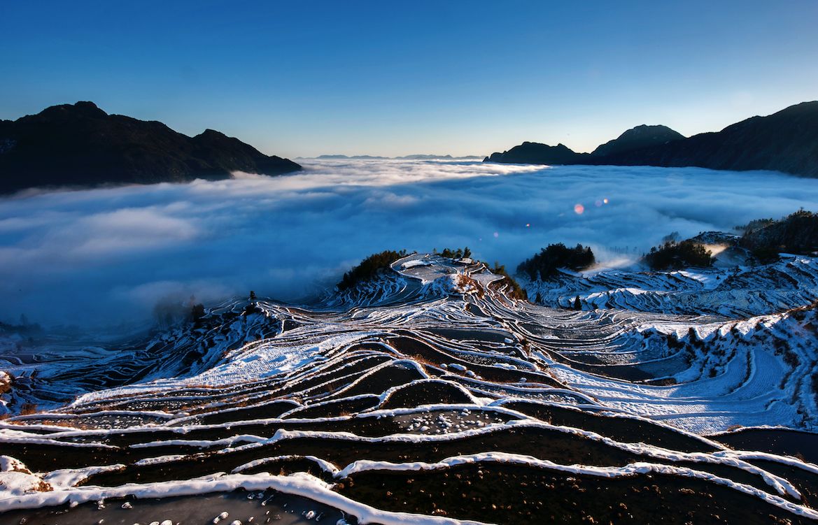 这里的梯田曾被美国CNN评为中国最美丽的40个景点之一,也被摄影界称为“中国最美梯田“,下过雪后美成一幅水墨画,冷峻的黑白色、调鬼斧神工的几何线条,美得毫不费劲;