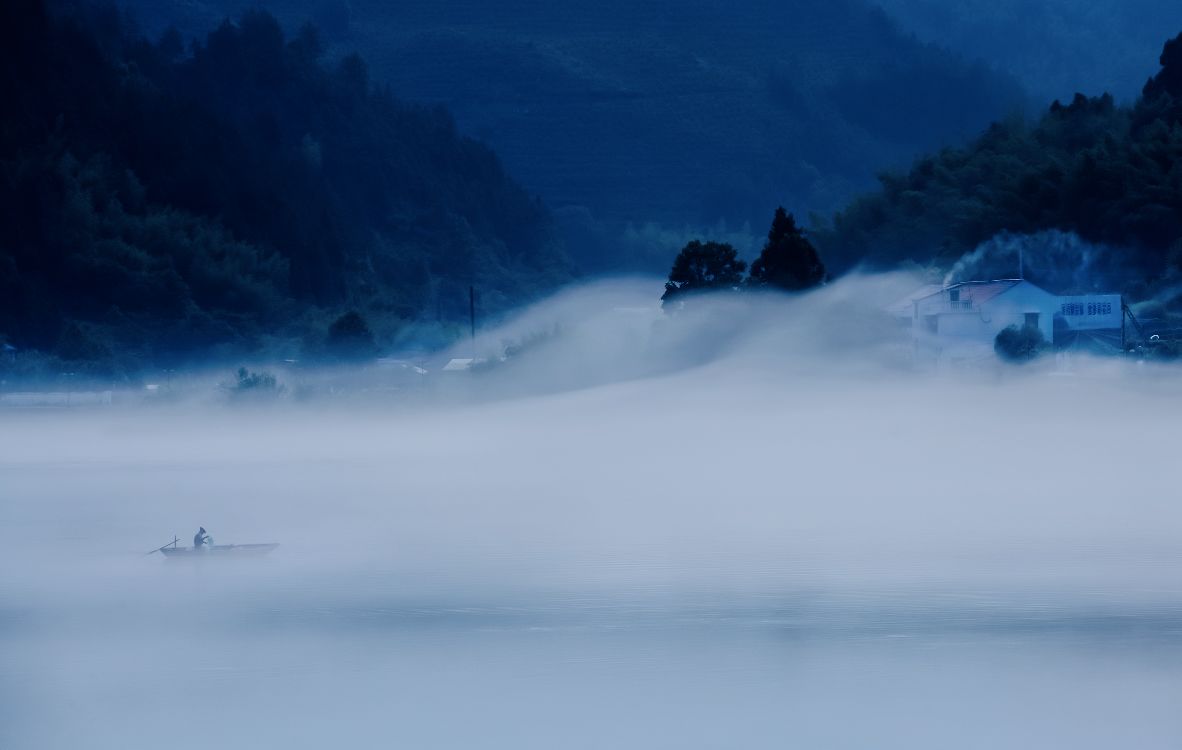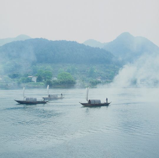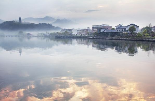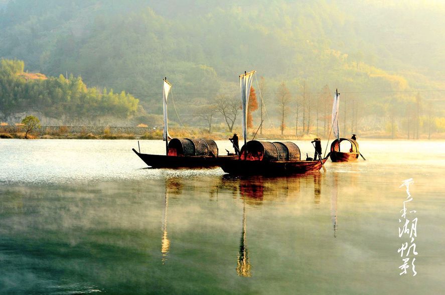 寒冬的早晨,云和湖水由于湖坝的高差产生上下湖水温差,湖面上升起浩渺烟波,木排竹筏、山色村落在湖雾中若隐若现,仿佛置身仙境。