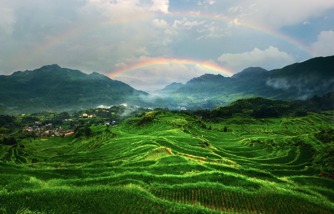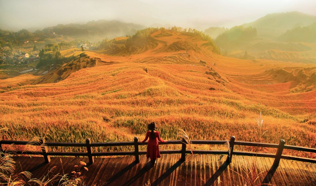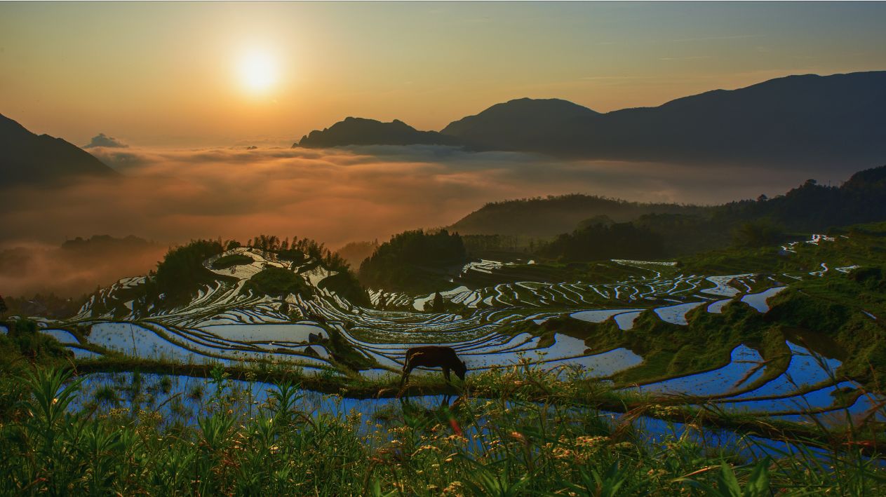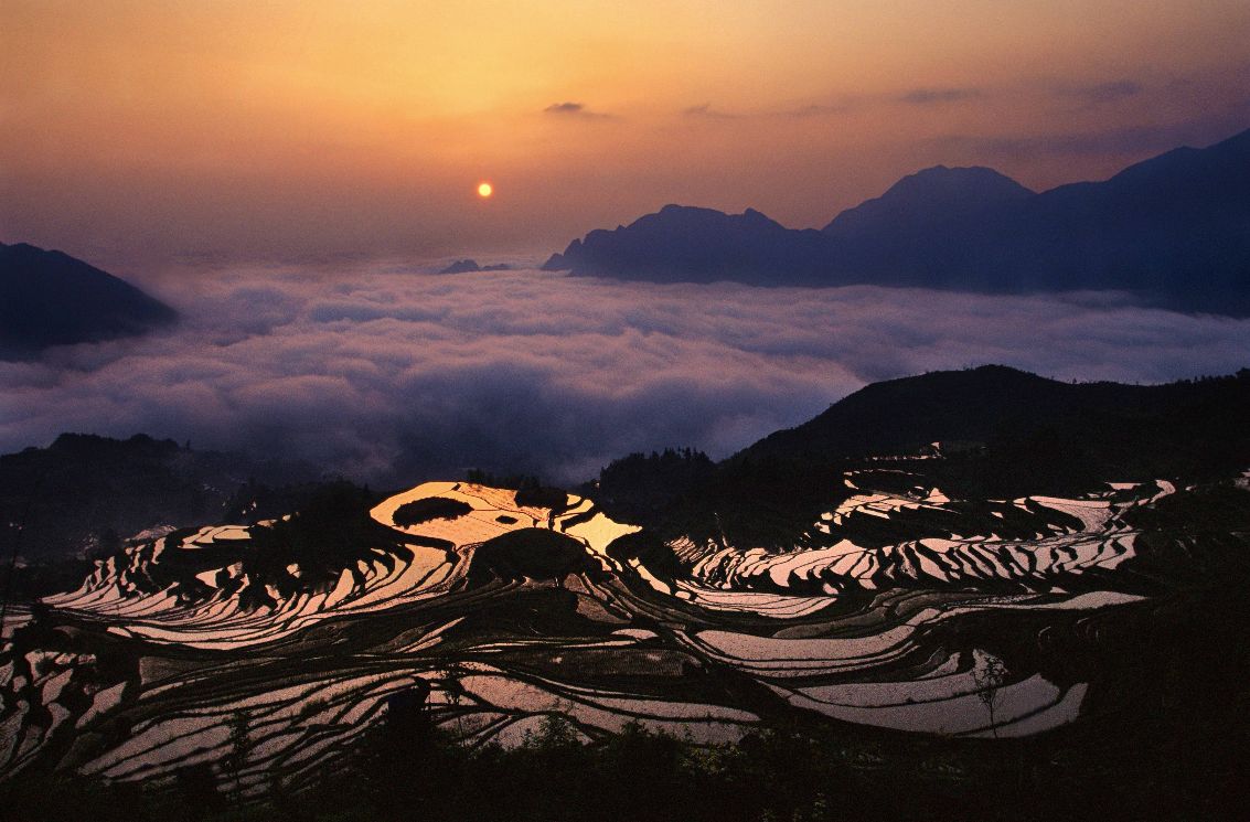 它曾被美国CNN评选为中国最美40个景点之一。千层梯田错落有致,起起伏伏,在眼前山谷下铺开,尤其是日出时分,当晨曦突破厚重的云层洒落大地,云雾缭绕其中,远处山峰隐现,成为了摄影爱好者们追捧的摄影胜地。