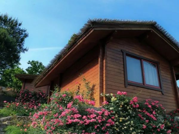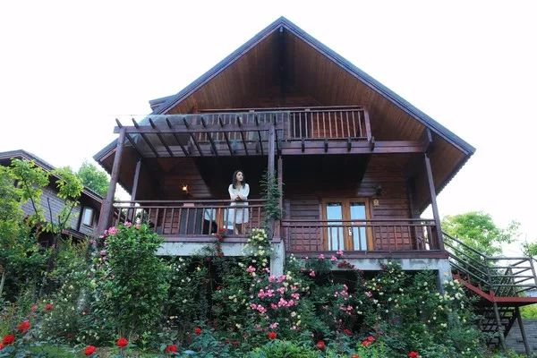 一栋栋独立的棕红色小木屋点缀在青山中,若隐若现,屋前植被与鲜花环绕,像极了梦中的那个山间小舍,有阳光,有花香。