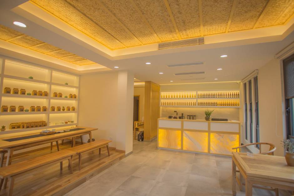 云上五天的房间不多,一共7间,每间风格迥异但都干净整洁,别具风味。你可以在阳台小憩,品一盏香茗,眺望远处云雾缭绕的岱山;或是去云上图书静静地坐上一下午,这里摆满一整面墙的书,会让你找到属于你的一方天地。