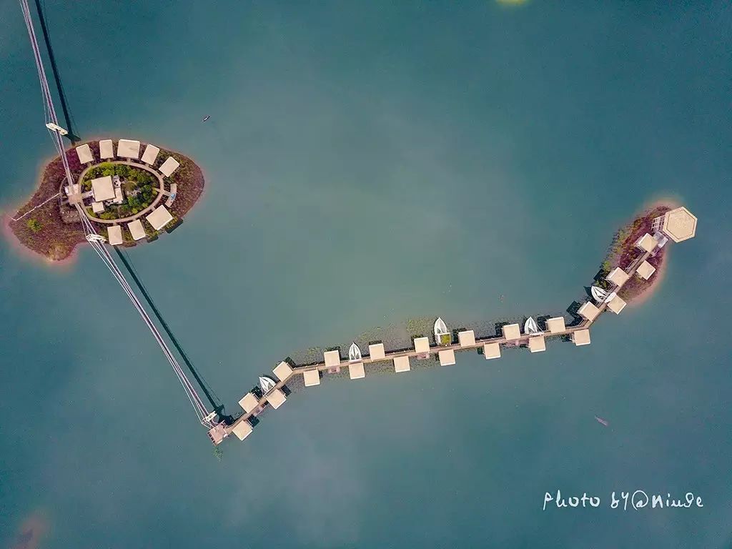 匆匆到此一游的人们基本不会发现,因为只有从空中俯瞰时,你才会发现这里竟然还有这么一处远离喧嚣的度假酒店。如同乌托邦式的理想社会,漂浮于湖面之上,又存在于青山的怀抱中。