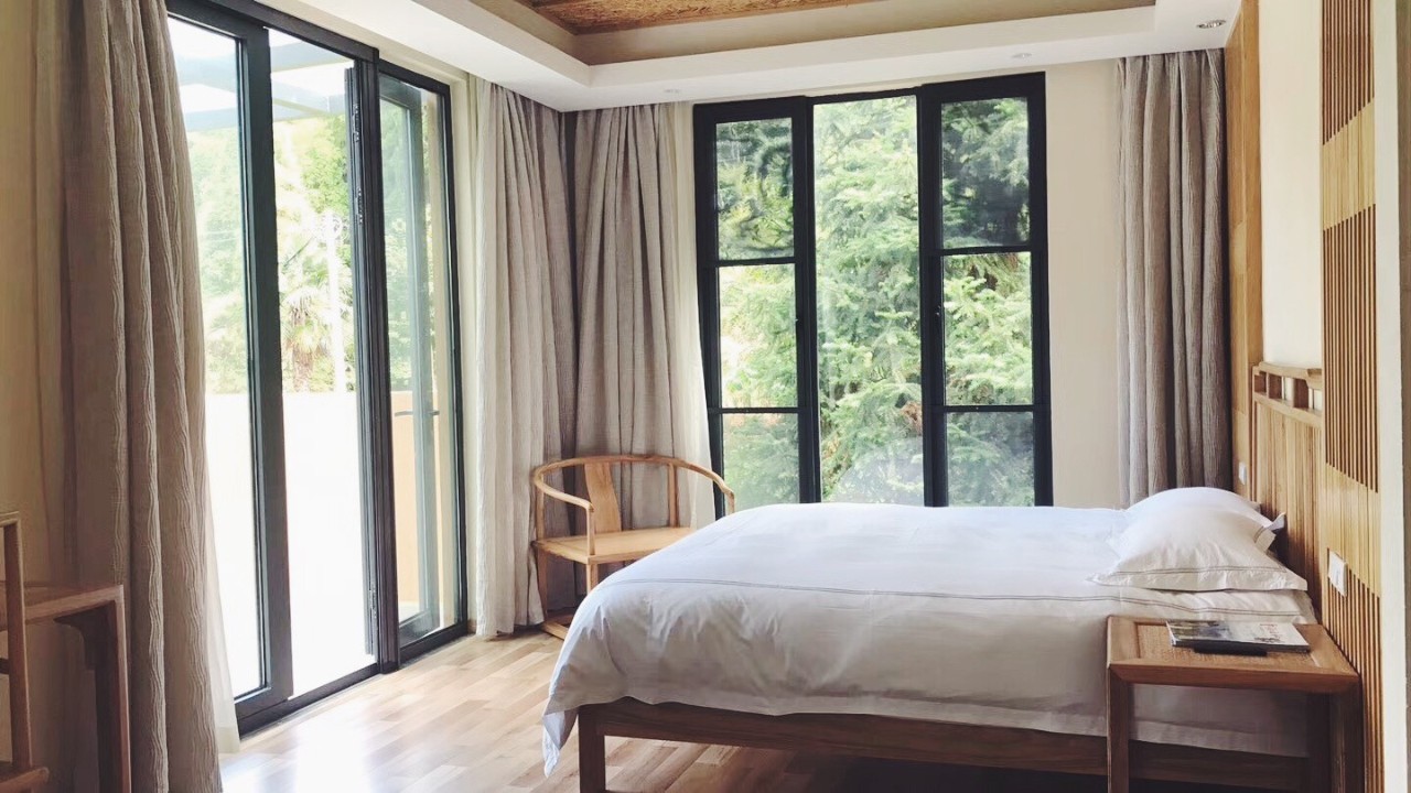 房间大面积的落地窗,将大自然零距离搬进屋内。竹林山间,白云深处,这里没有雾霾没有车流,只有风轻云淡的时光。即使住遍了全球各地的五星级酒店,还是觉得大山深处、泉水溪畔的云谷山房,温馨得无可替代。